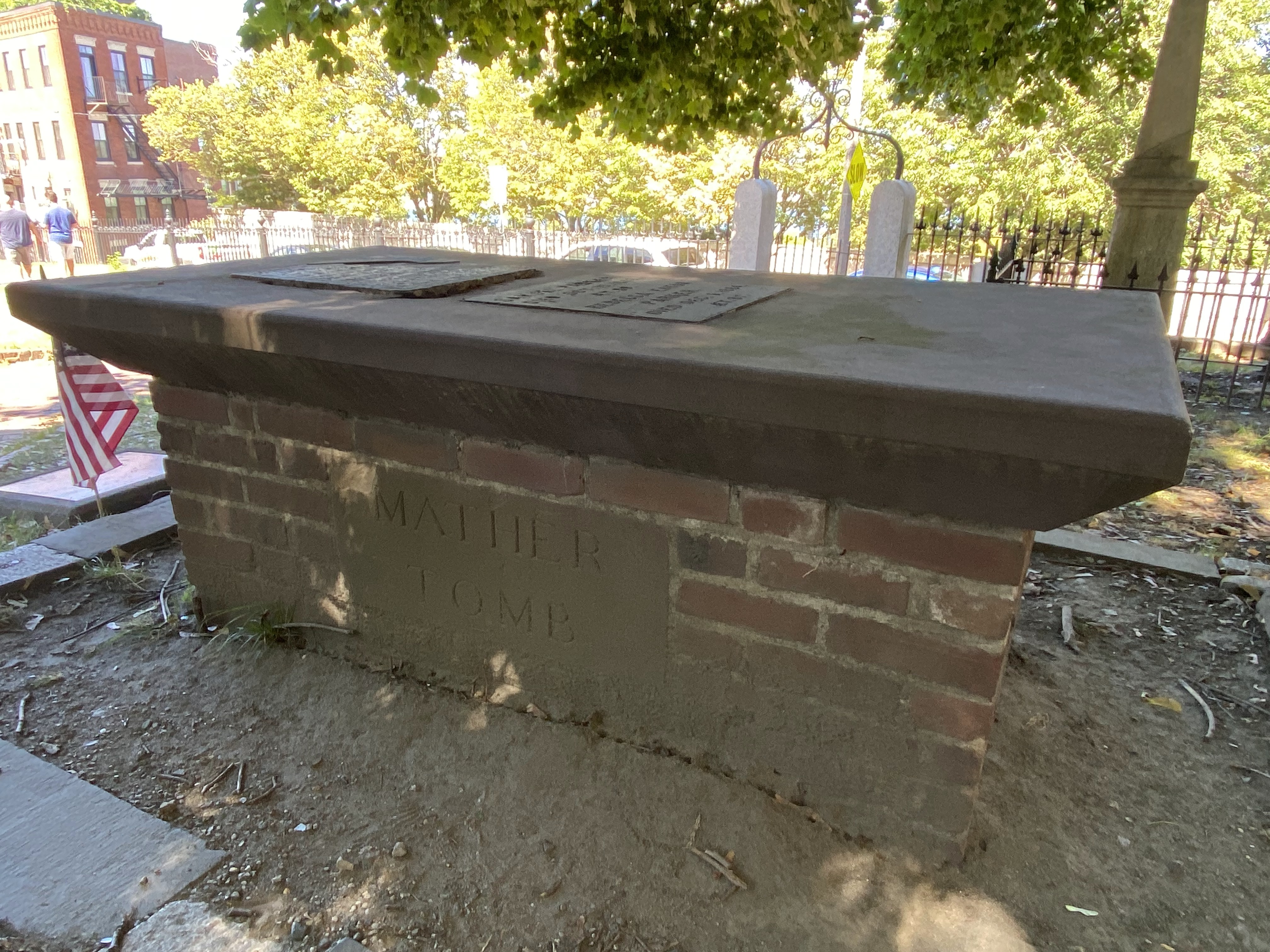 Plaque reads, ”Several generations of the great 17th and 18th century New England divines are buried here. Increase (1639-1723), the father of Cotton (1663-1728) the son and Samuel Mather (1706-1785) the grandson, belonged to a remarkable family of ministers. At a time when the church wielded its own power and religious zeal translated into political influence, the Mathers’ ecclesiastical attainments assured them secular authority.
