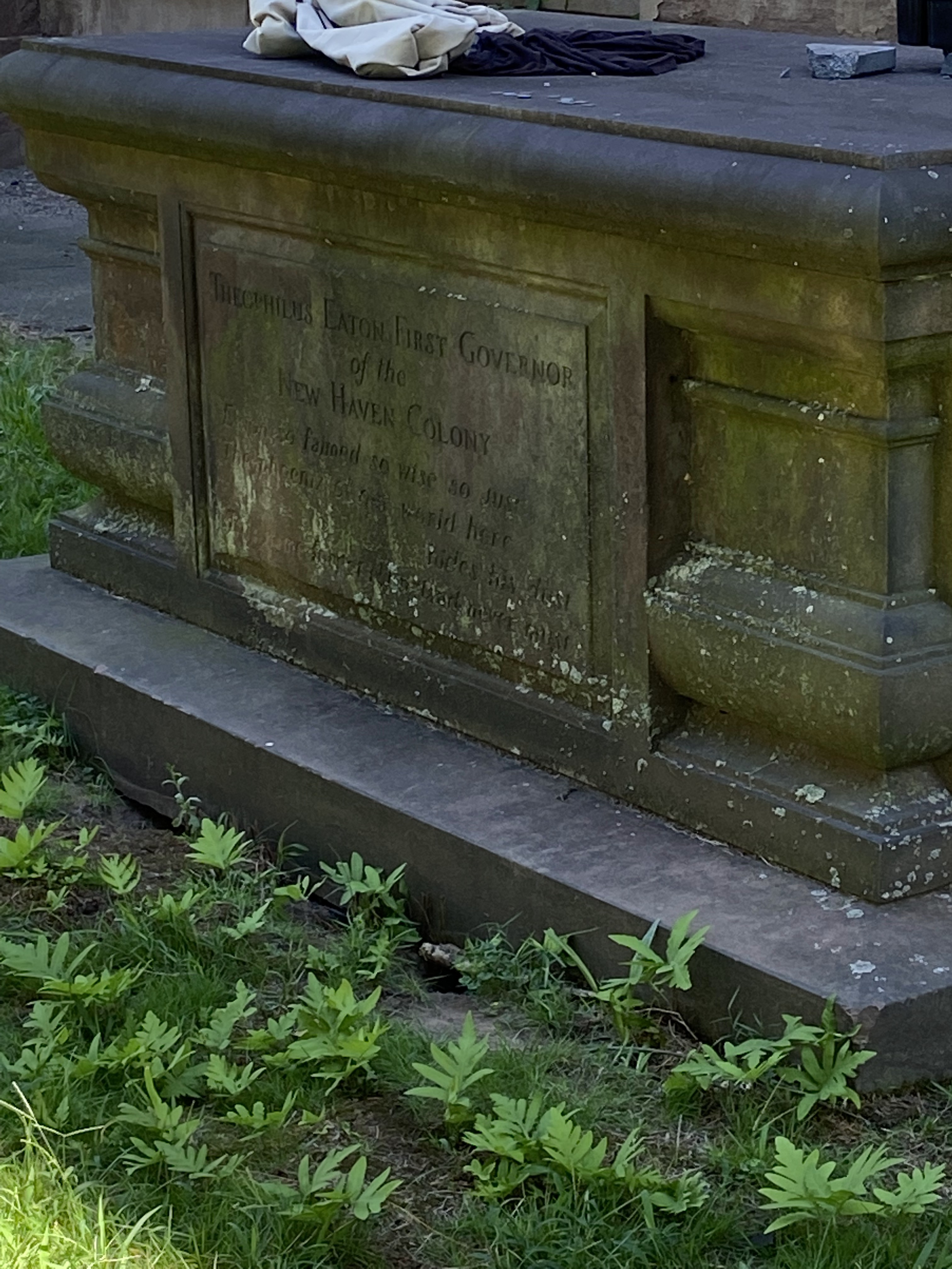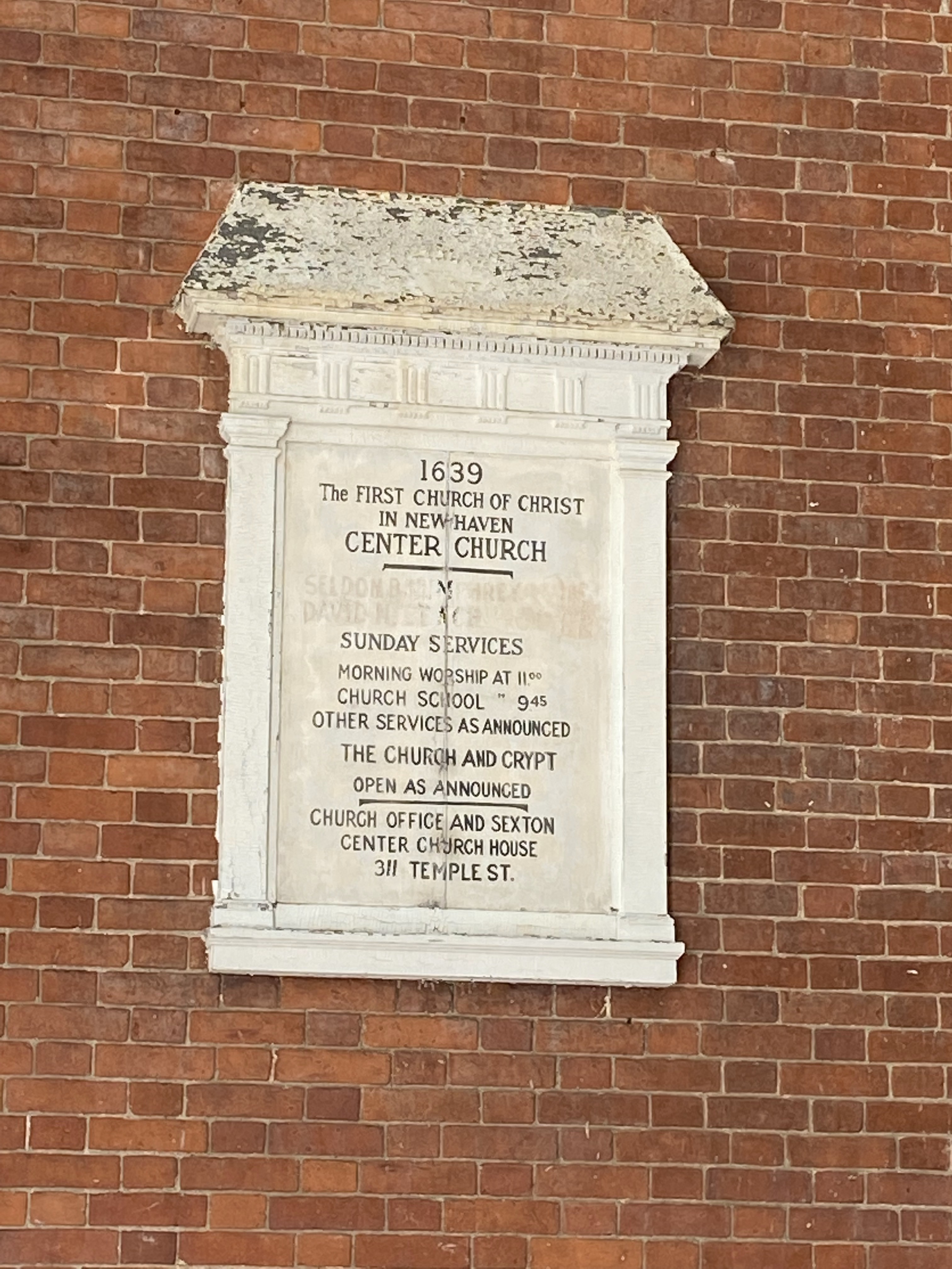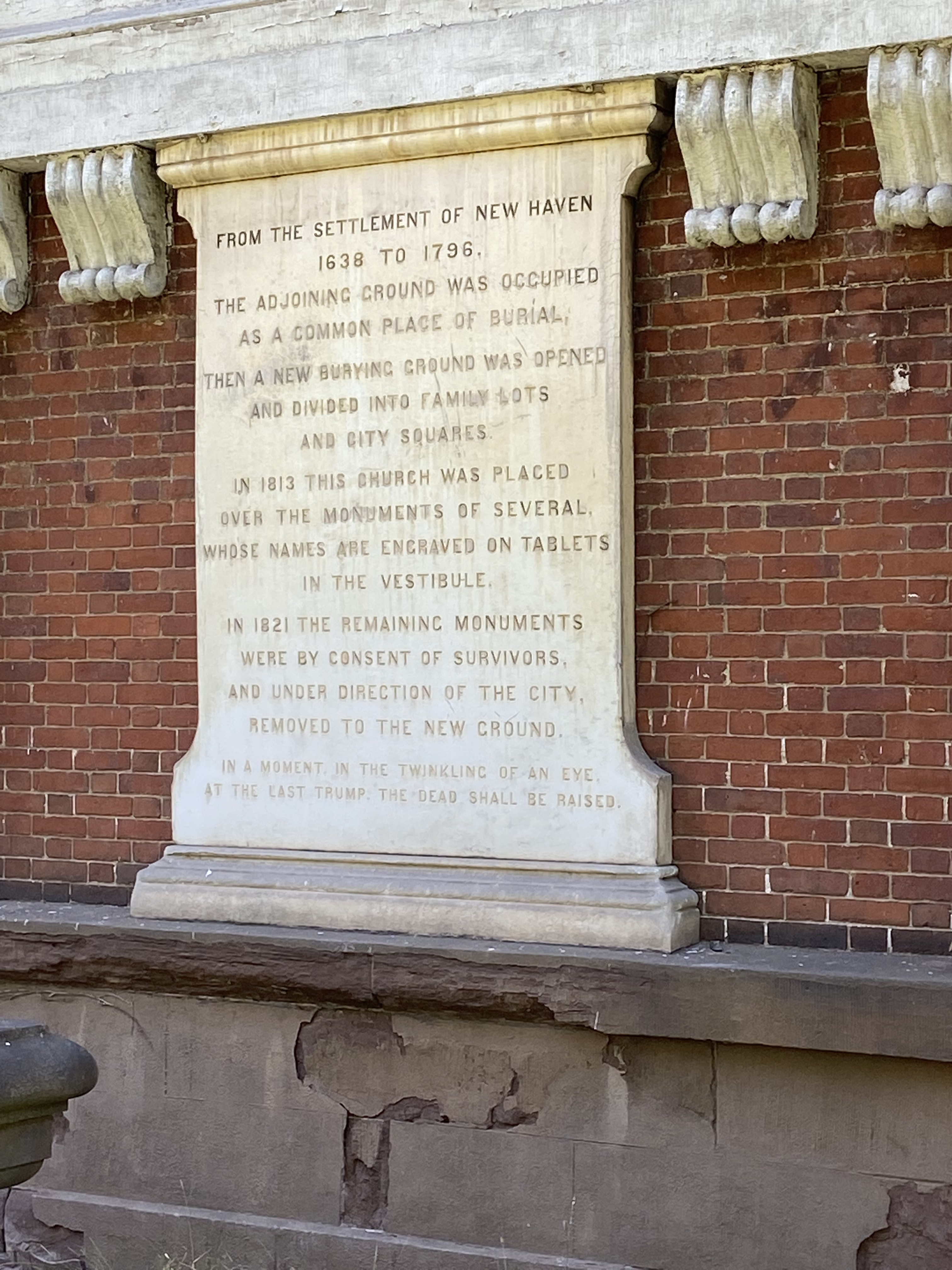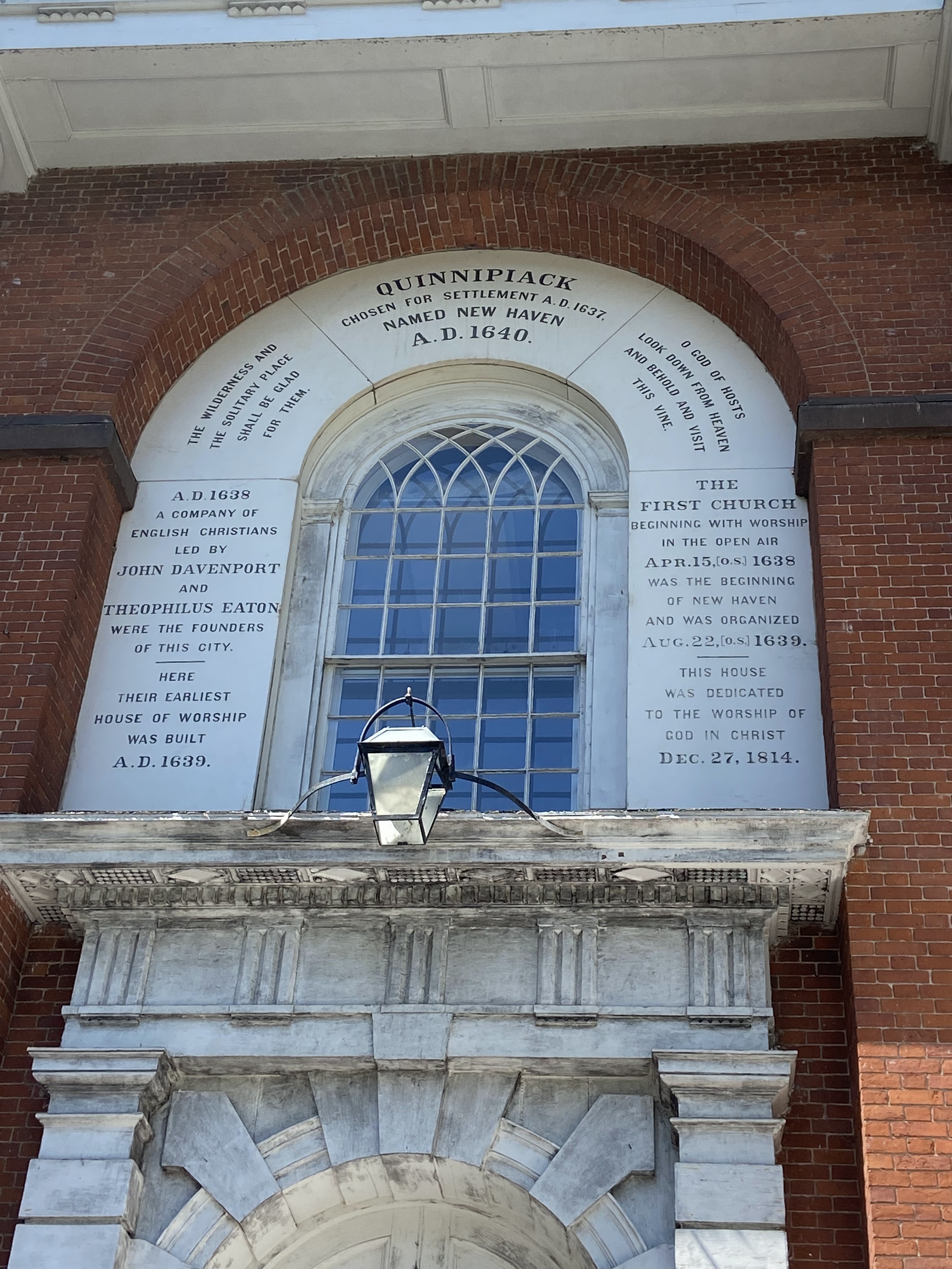 The wording around the arched window says, ” AD 1638 A company of English Christians led by John Davenport and Theophilus Eaton were the founders of this city. Here their earliest house of worship was built AD 1639. The first church beginning with worship in the open-air April 15, 1638, was the beginning of New Haven and was organized Aug 22, 1639. This (current) house was dedicated to the worship of God in Christ. Dec 27, 1814″