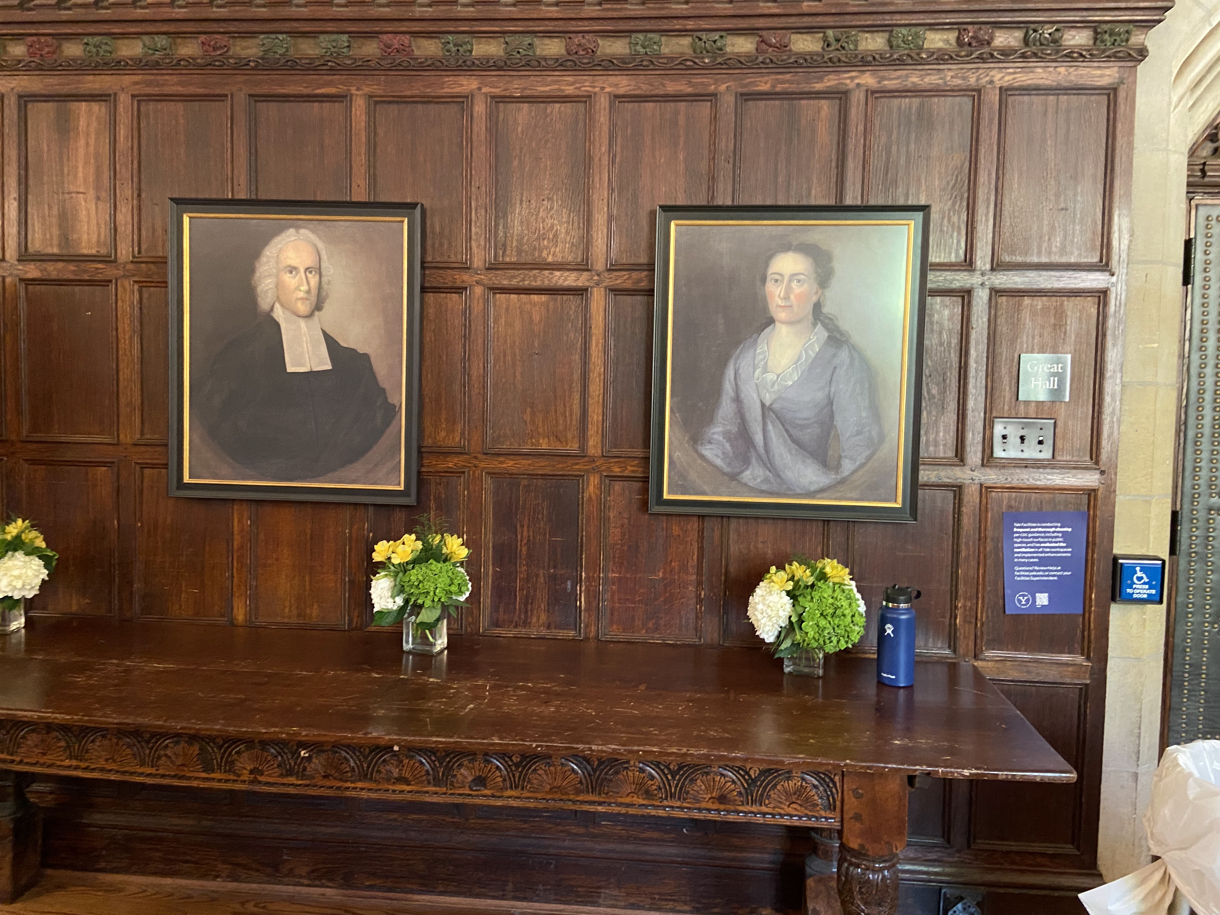 Pictures below include: the gates and arch into the lovely college center courtyard and surrounding buildings. Inside the Kent Hall are replicas of the Princeton tombstones of Jonathan and Sarah as well as their portraits. The glass plaque on the wall says,