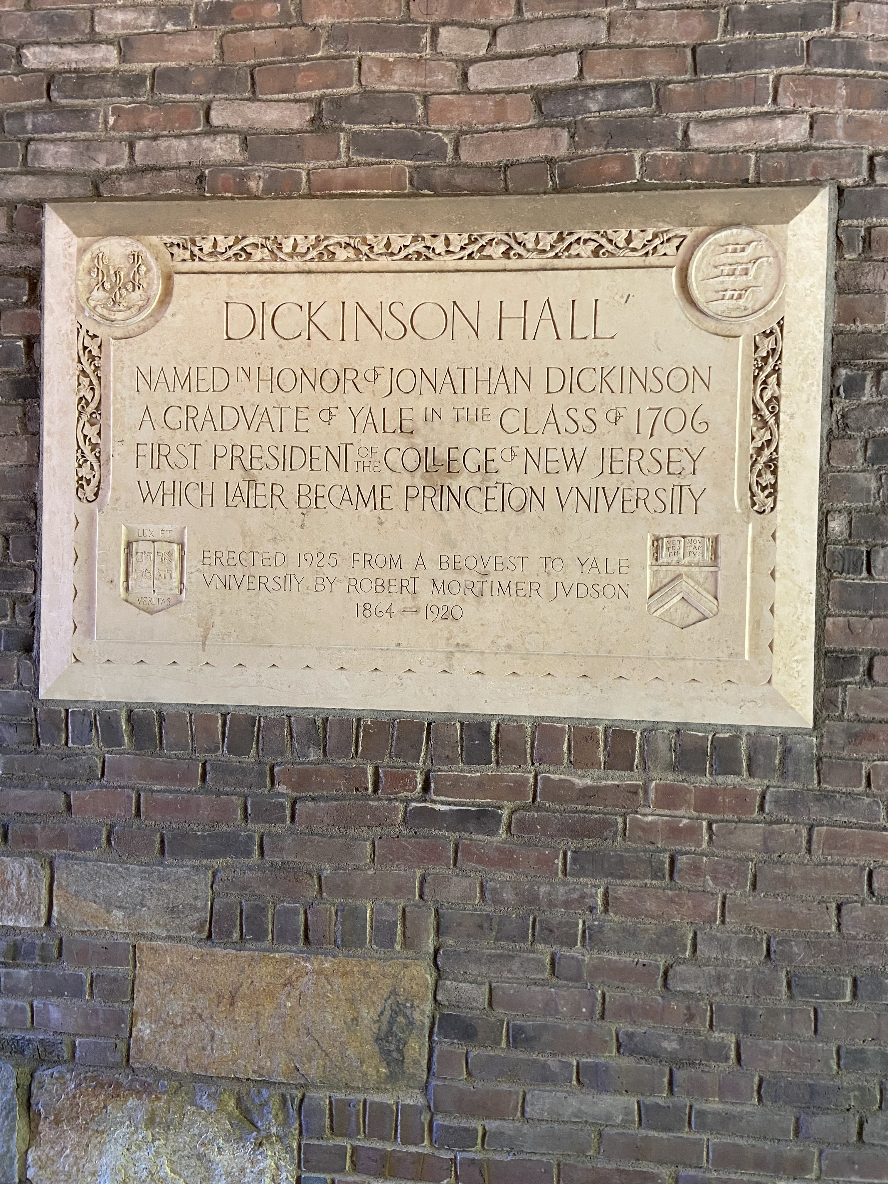 There is also hanging at Dickinson Hall within the College a plaque to Jonathan Dickinson the first President of what would become Princeton University. It reads, “Dickinson Hall Named in honor of Jonathan Dickinson a graduate of Yale in the class of 1706. First President of the College of New Jersey which later became Princeton University”