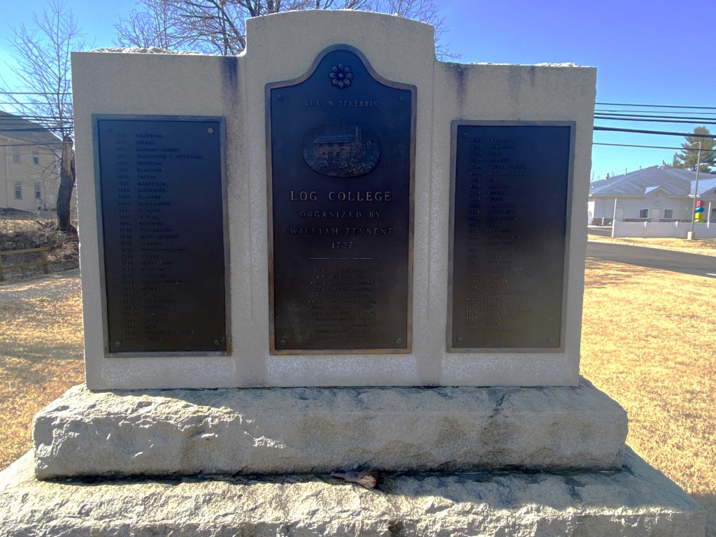 The large monument reads, “Post Tenebris Lux (after darkness, light) Log College Organized by William Tennent 1727 Here, in the life of a pioneer teacher, endued with spiritual passion; wrought to vitalize knowledge, glorify truth, enrich life, and in due time call forth, to the glory of God and the welfare of American youth, these worthy Christian colleges. The monument lists sixty-three colleges that flowed out of the humble Log College. The first being Princeton University.