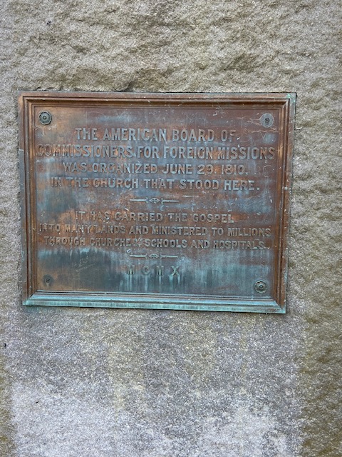 The plaque in front of the church says, “The American Board of Commissioners for Foreign Missions was organized June 29, 1810 in the church that stood here. It has carried the Gospel into many lands and ministered to millions through churches, schools and hospitals.”